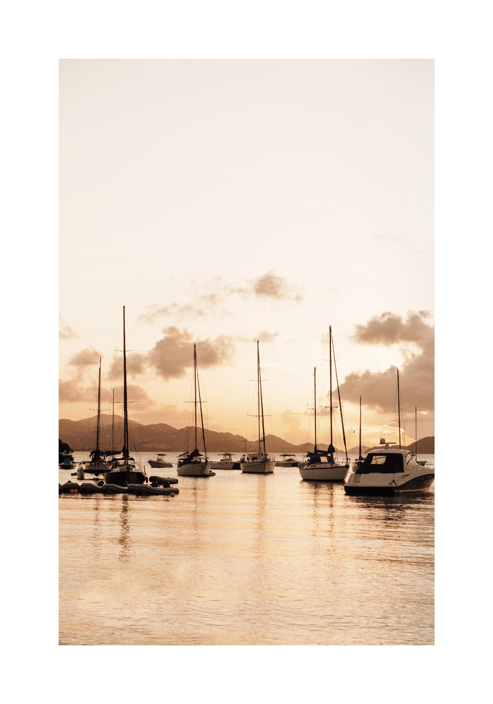 Beautiful photography poster of a few boats floating in the sea at sunrise. The rising sun gives a beautiful reflection in the sea water, which creates a wholesome range of beautiful colours to the whole poster. The poster has a printed white margin that frames the design.