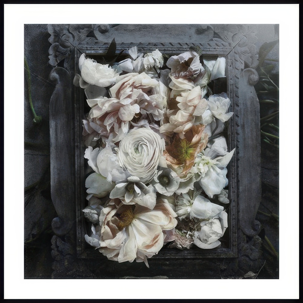 A beautiful romantic style, botanical poster of an old-fashioned picture frame filled with flowers in pastel pink tones. The background is matte gray and creates a nice contrast with the bright flowers. The poster is part of the Love Warriors photo series "FLORA".