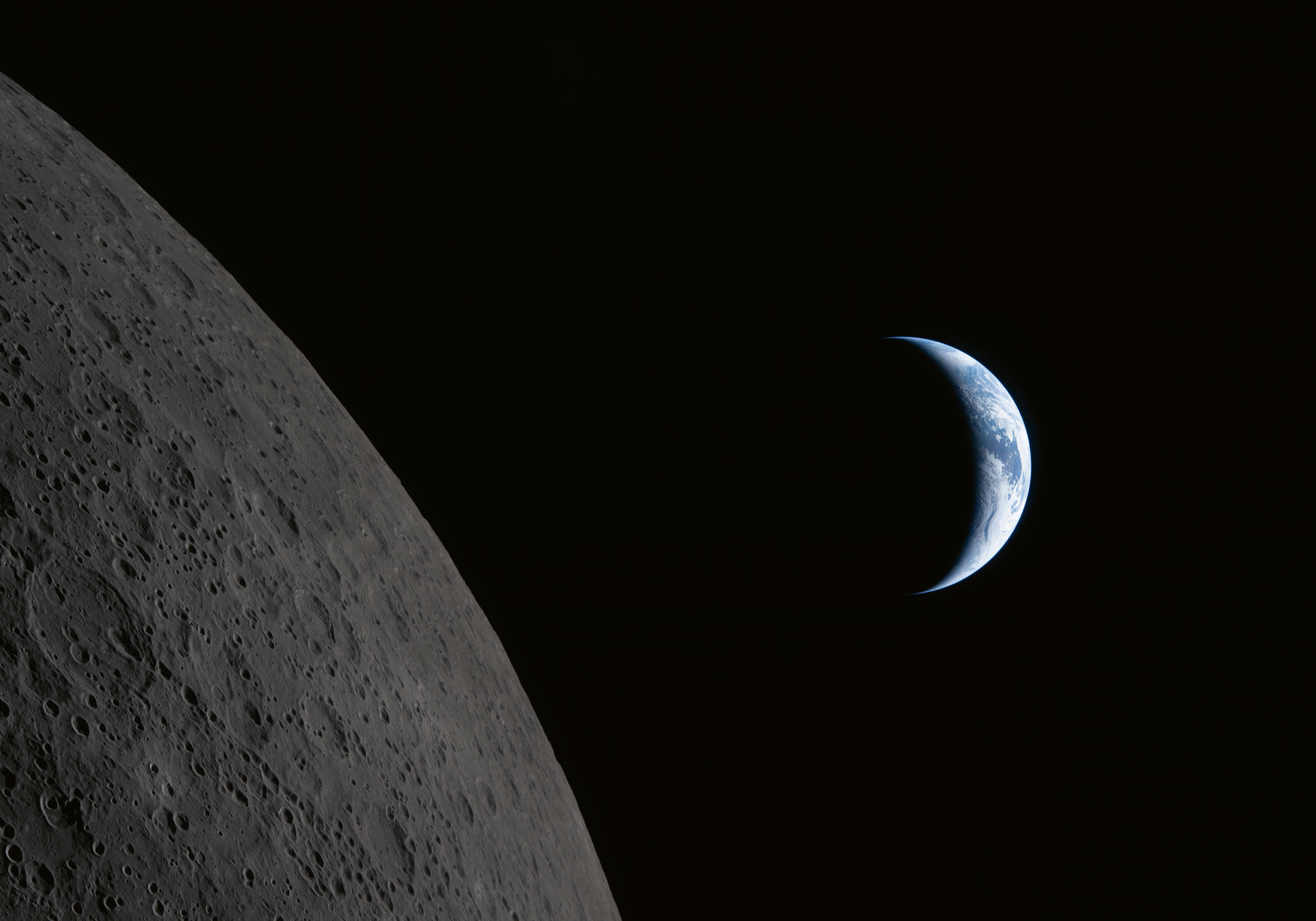 A poster of the moon and Earth against a black space background. The moon's grey cratered surface is shown on the left, while Earth appears as a small blue and white crescent on the right.