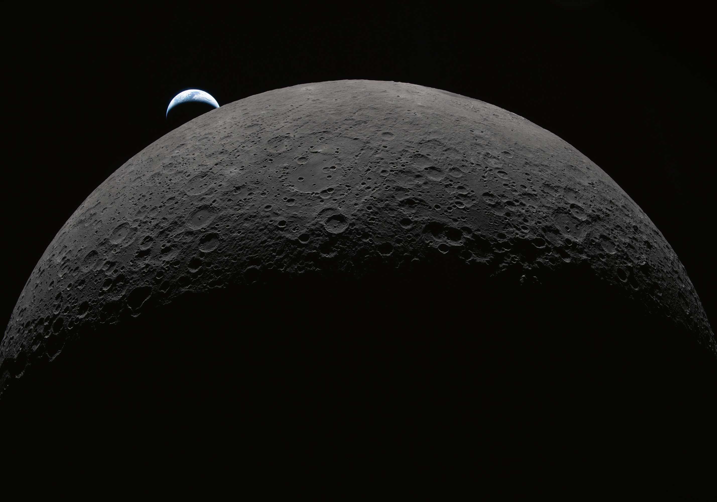 A poster featuring the Moon's grey, cratered surface with Earth appearing as a small blue and white crescent above it. Perfect wall art for space lovers.