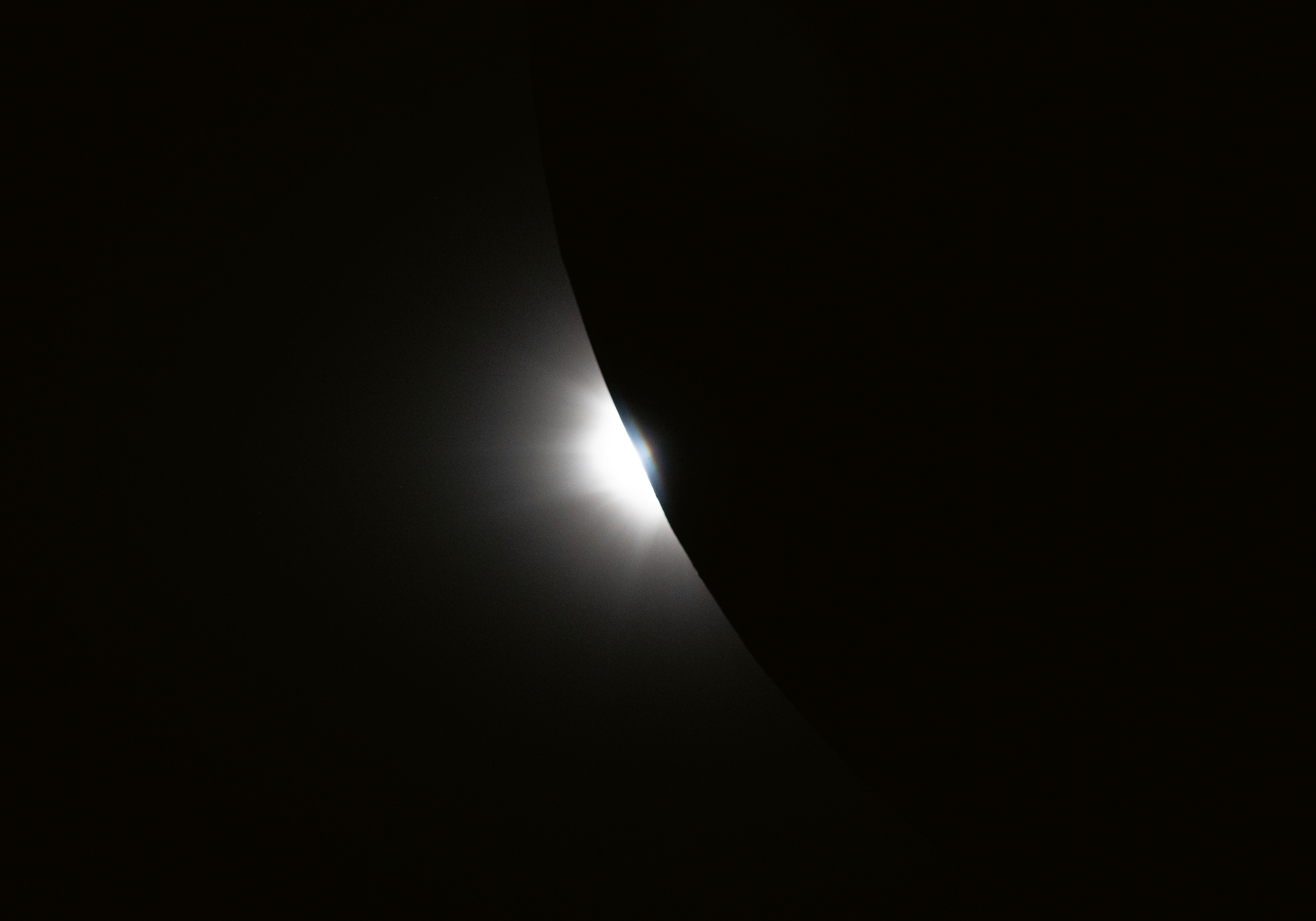 A poster featuring a dark curved shape with a bright light glowing from behind, creating a dramatic starburst effect against a black background.