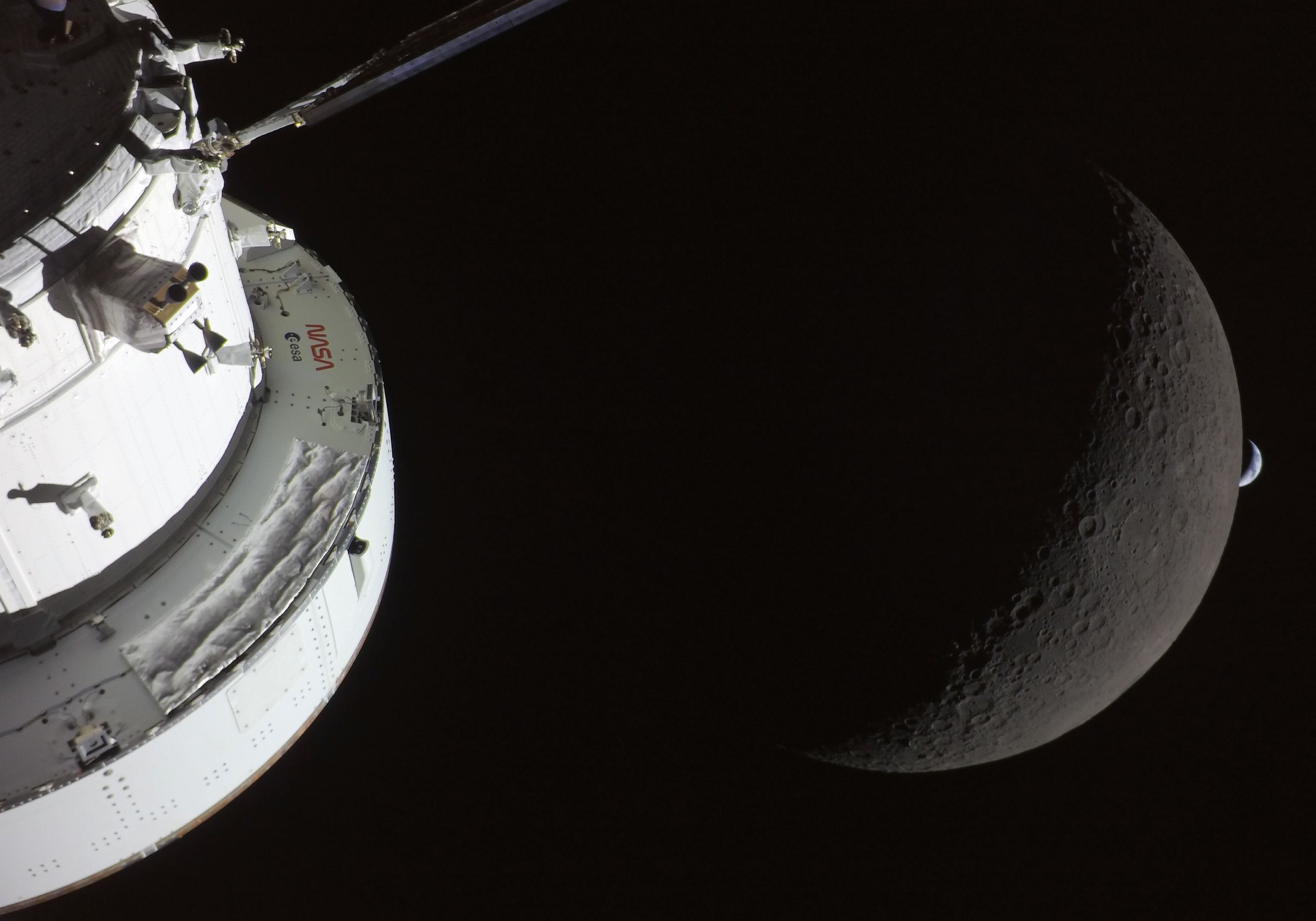 A poster featuring a white NASA spacecraft, a crescent moon with craters, and planet Earth in the background against dark space.