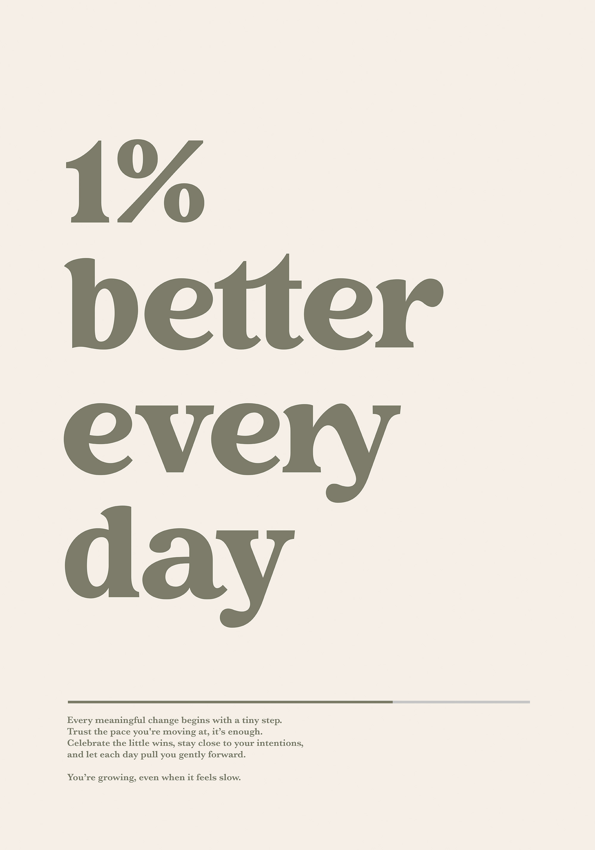 Motivational poster with the text "1% better every day" in grey on a beige background. Perfect for adding daily inspiration to your home.