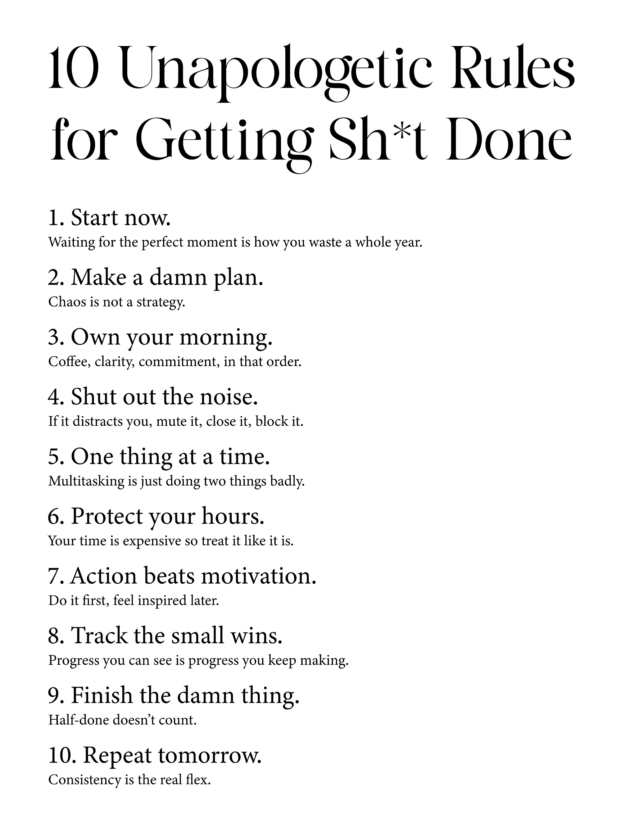 A motivational poster with 10 rules for getting things done. Black text on a white background with a simple and clear design.