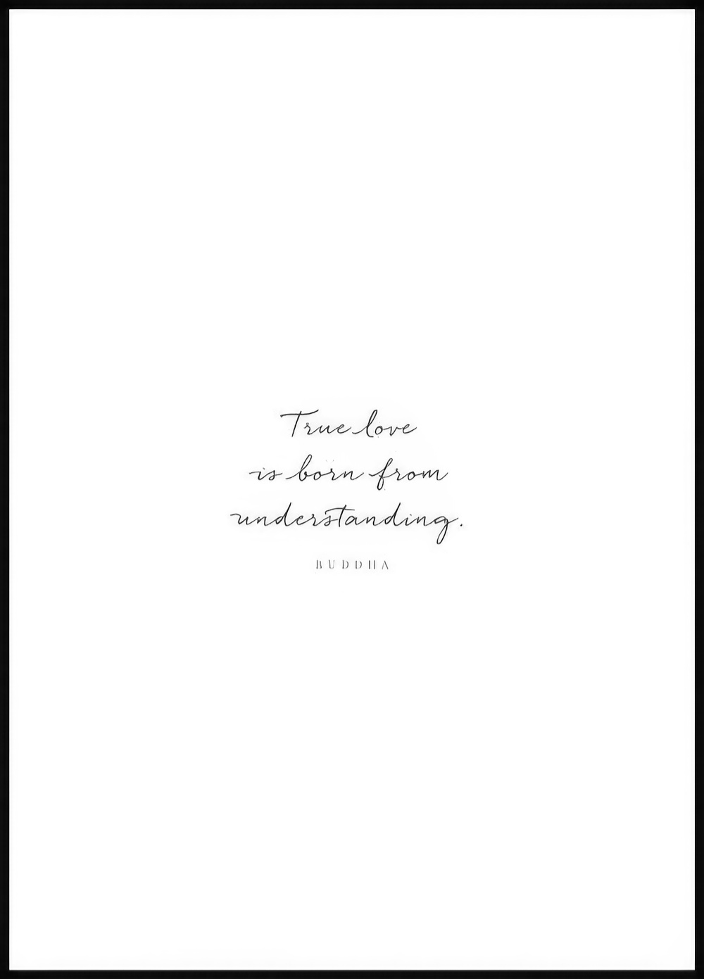 Beautiful simplistic Buddha poster with the quote 'True love is born from understanding'. A Buddha is someone who is able to completely awaken themselves, and shares his/her knowledge with others allowing them to awaken as well.