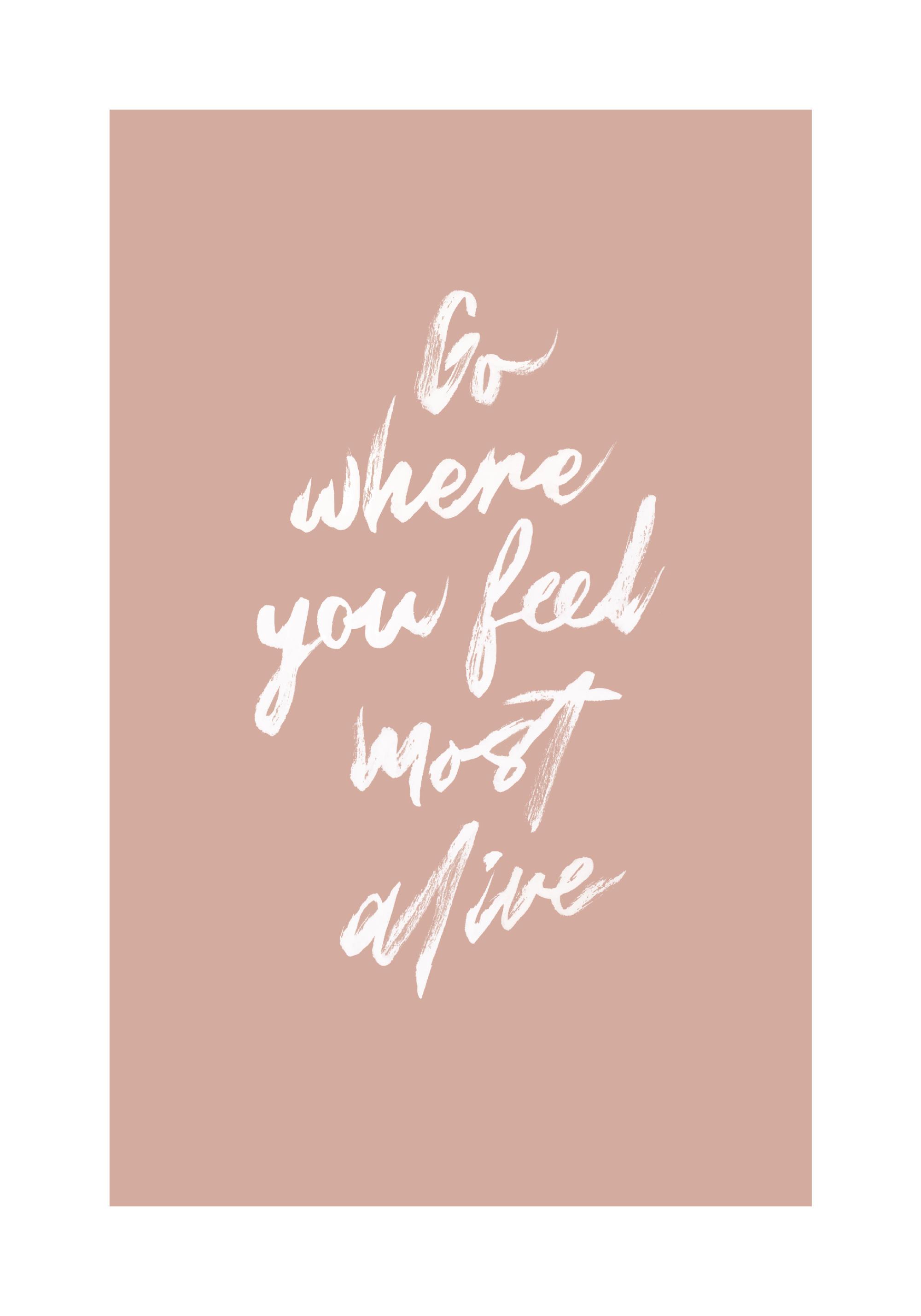 From $31Cute typographic poster with the text 'Go where you feel most alive' written in white on a pink background. The quote expresses that one should love and enjoy what they're doing without thinking about the past nor the future, as to live life with the means you have and embrace it. The poster has a printed white margin that frames the design.