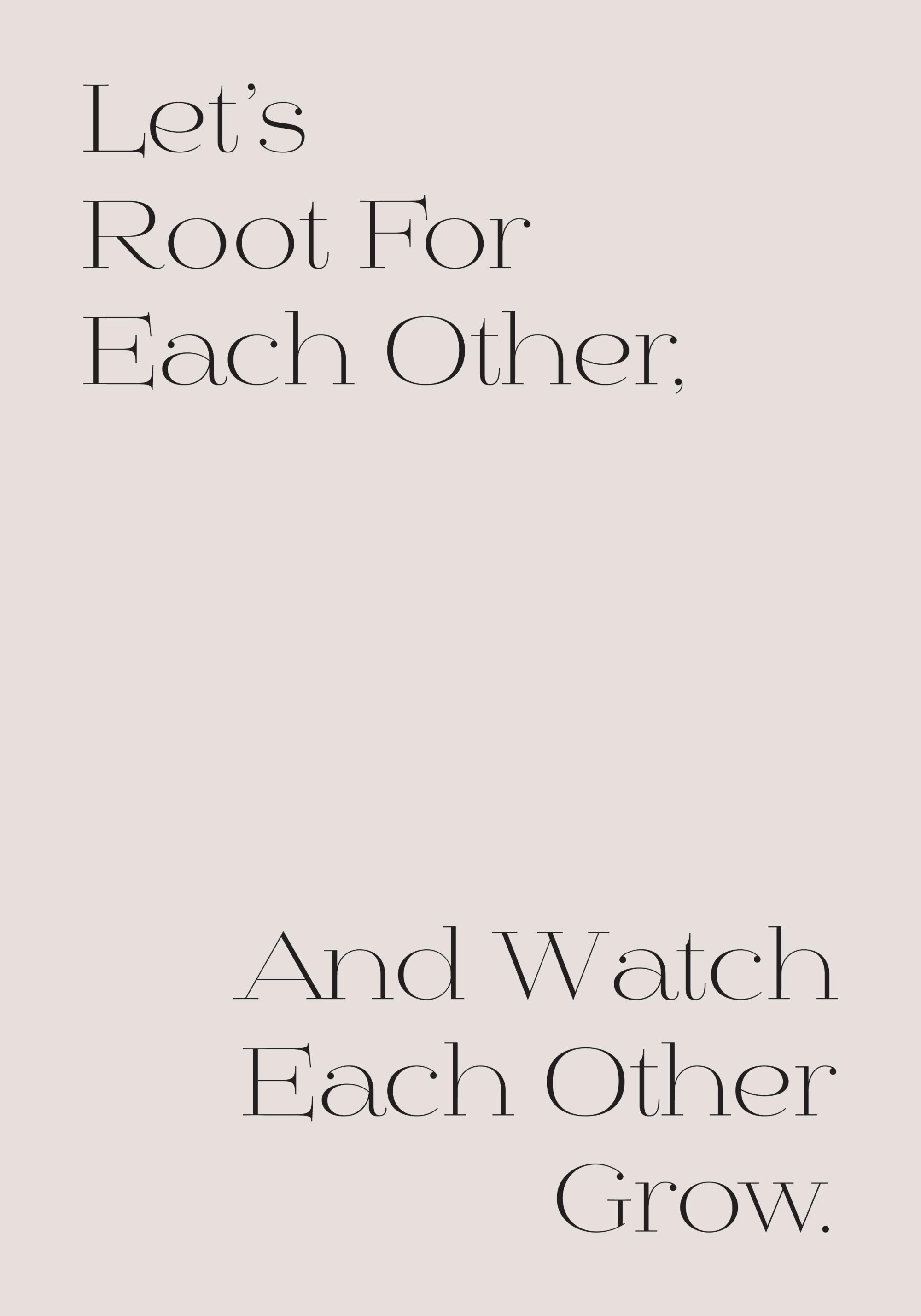 Quote print in beige with the text "Let's root for each other and watch each other grow". A motivational quote about a relationship that shows it's okay to see each other grow in other directions, as long as you have your basics in the same place.