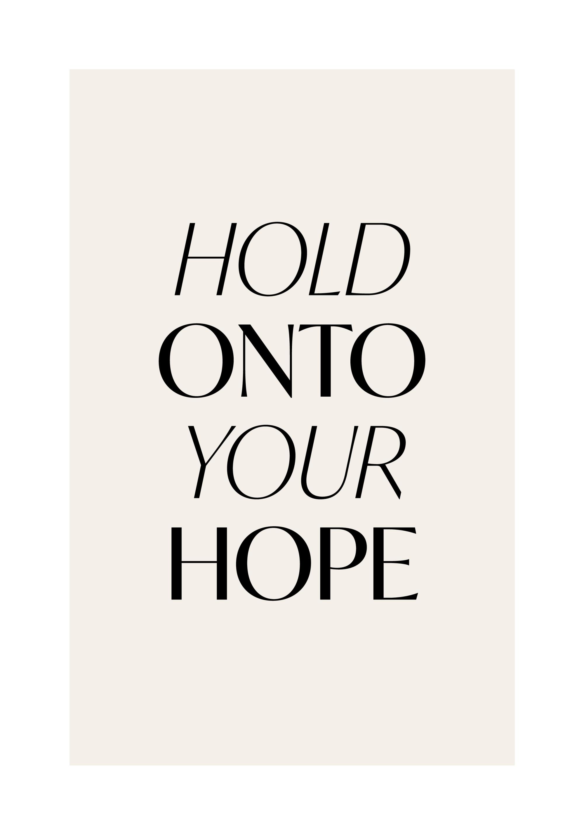 From $31Quote print in black with beige background and the text 'Hold Onto Your Hope'. A friendly reminder to always believe in yourself and don't lose your hope. A text poster is a great addition to your gallery wall or as a nice decoration on your drawer!