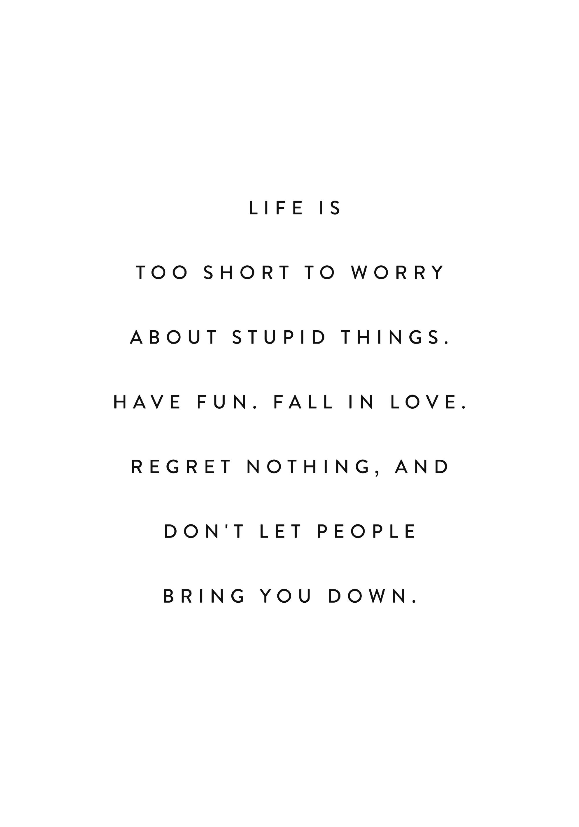 From $31A poster with some encouraging words to make you think about the fact that life is short and it's not worth it to have regrets or worry too much. The text says: 'Life is too short to worry about stupid things. Have fun, fall in love, regret nothing, and don't let people bring you down.'