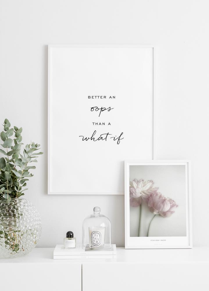 Cute poster that says: 'Better an oops than a what if.'. Sometimes you have to learn by making mistakes. Life is one big experiments. When it looks like a certain method didn't work, try to find another one! Just remember that when you don't do something you could regret it and wonder what could've happened if you had done it.