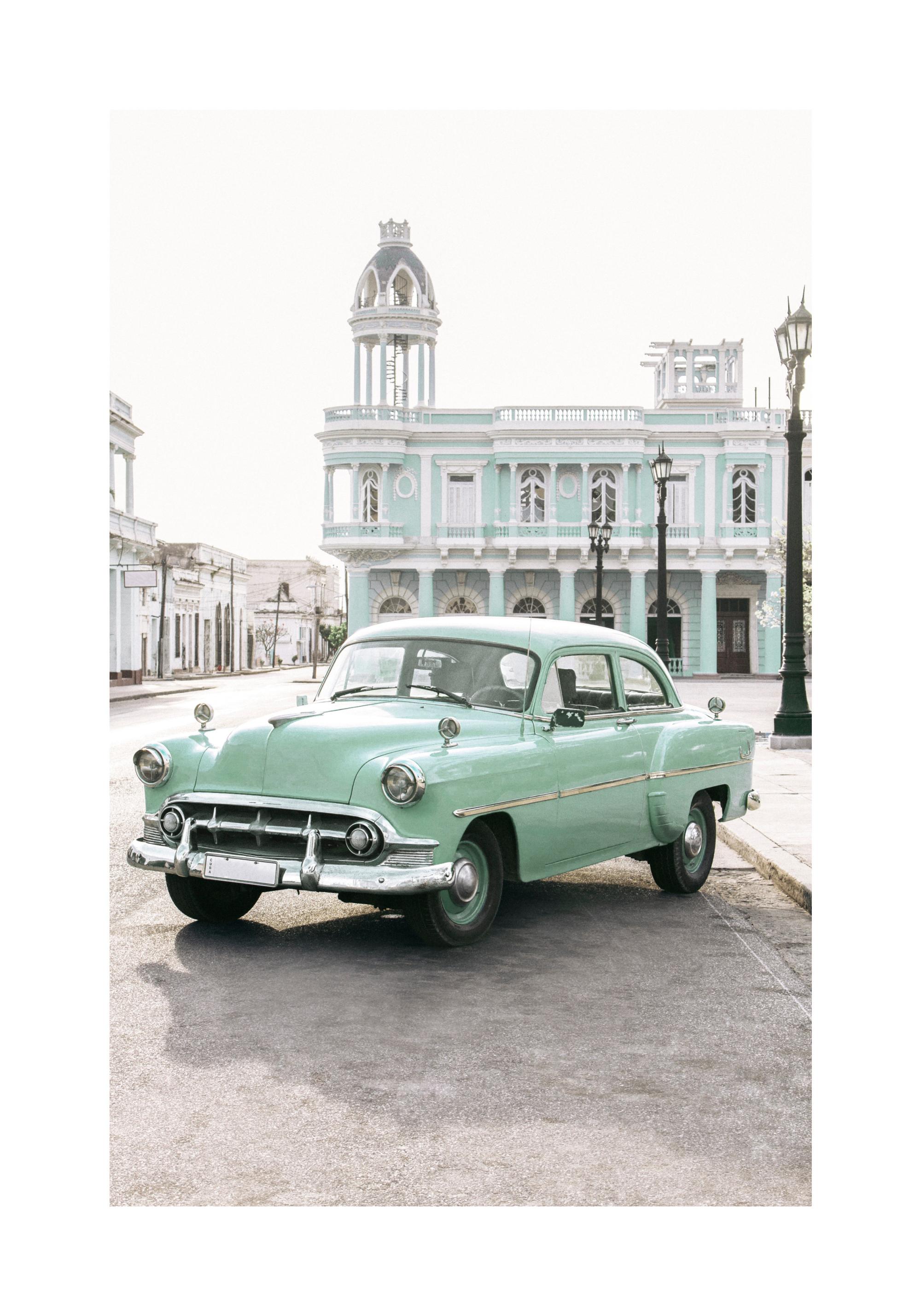 A great vintage poster of a green classic car in front of the light blue palatial building Palacio de Ferrer in Cienfuegos, Cuba. Let yourself be inspired by the Cuban diversity and bring the Cuban flair into your home with our posters. Satisfy your wanderlust with our prints from around the world.